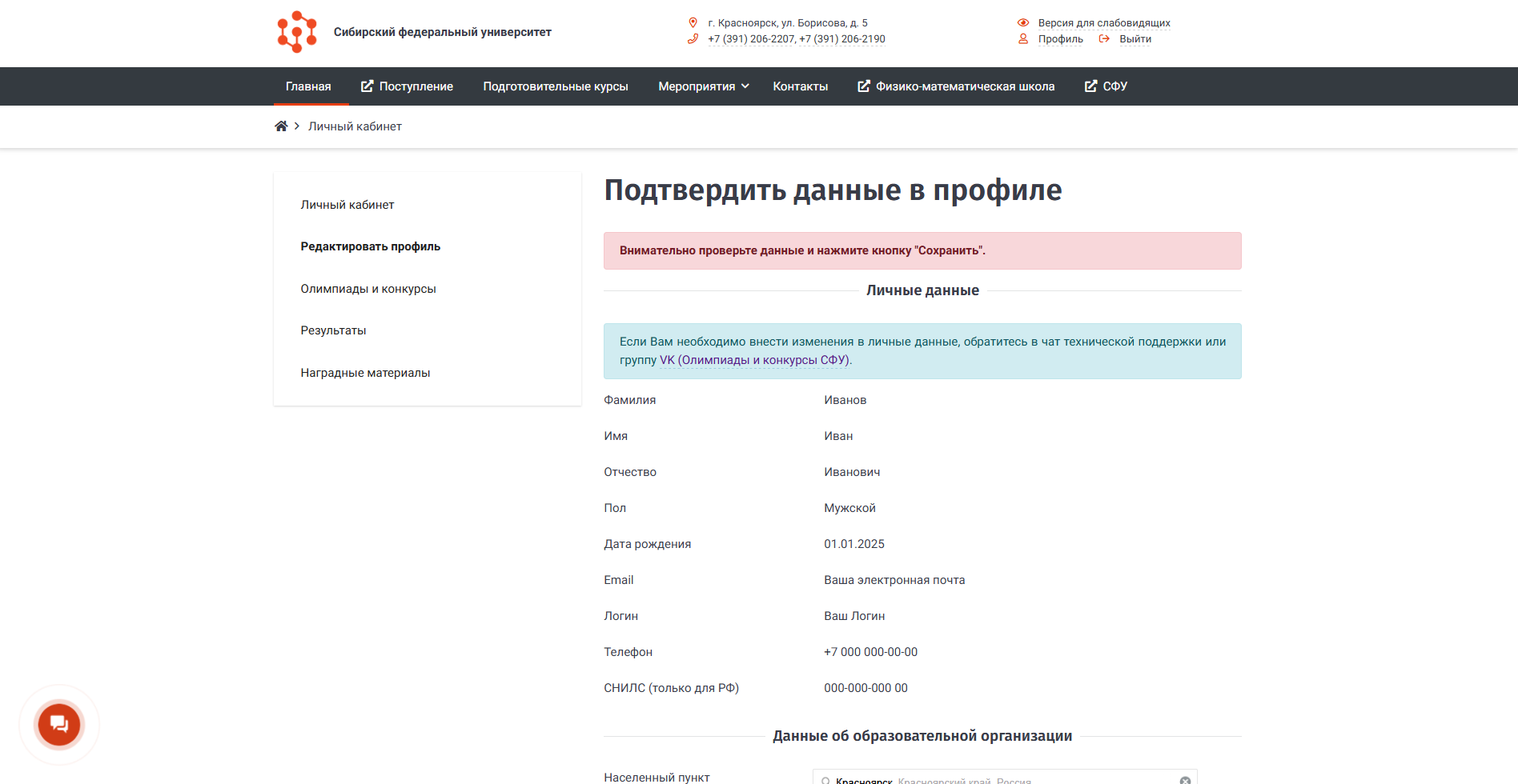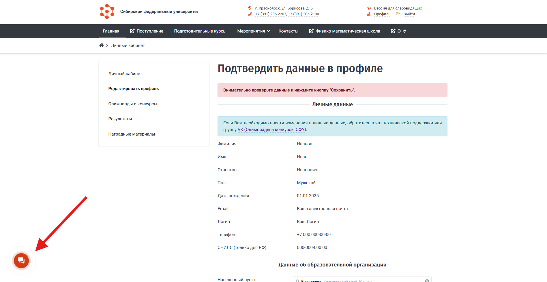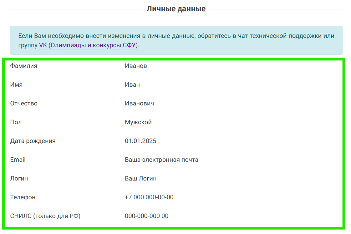 В разделе "Личные данные"(на изображении обведён зелёным прямоугольником) необходимо внимательно проверить: Фамилию, Имя, Отчество, Пол, Дату рождения, Ваш адрес электронной почты, Номер телефона, Номер Вашего СНИЛС (Только для РФ). В случае обнаружения некорректной информации, обратитесь в чат технической поддержки (значок в левом нижнем углу сайта) или группу VK (Олимпиады и конкурсы СФУ). В обращении укажите данные, которые необходимо скорректировать, а также данные регистрации - ФИО и электронную почту.