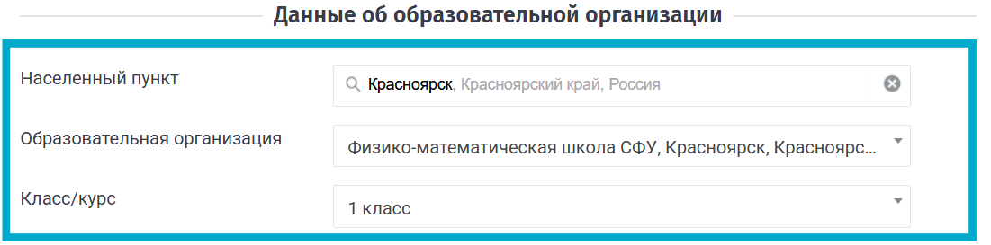 В разделе "Данные об образовательной организации" (на изображении обведён синим прямоугольником) необходимо внимательно проверить: Населённый пункт (это должен быть населённый пункт образовательной организации), Образовательную организацию, класс или курс ученика. В случае обнаружения некорректной информации, необходимо указать правильную информацию.