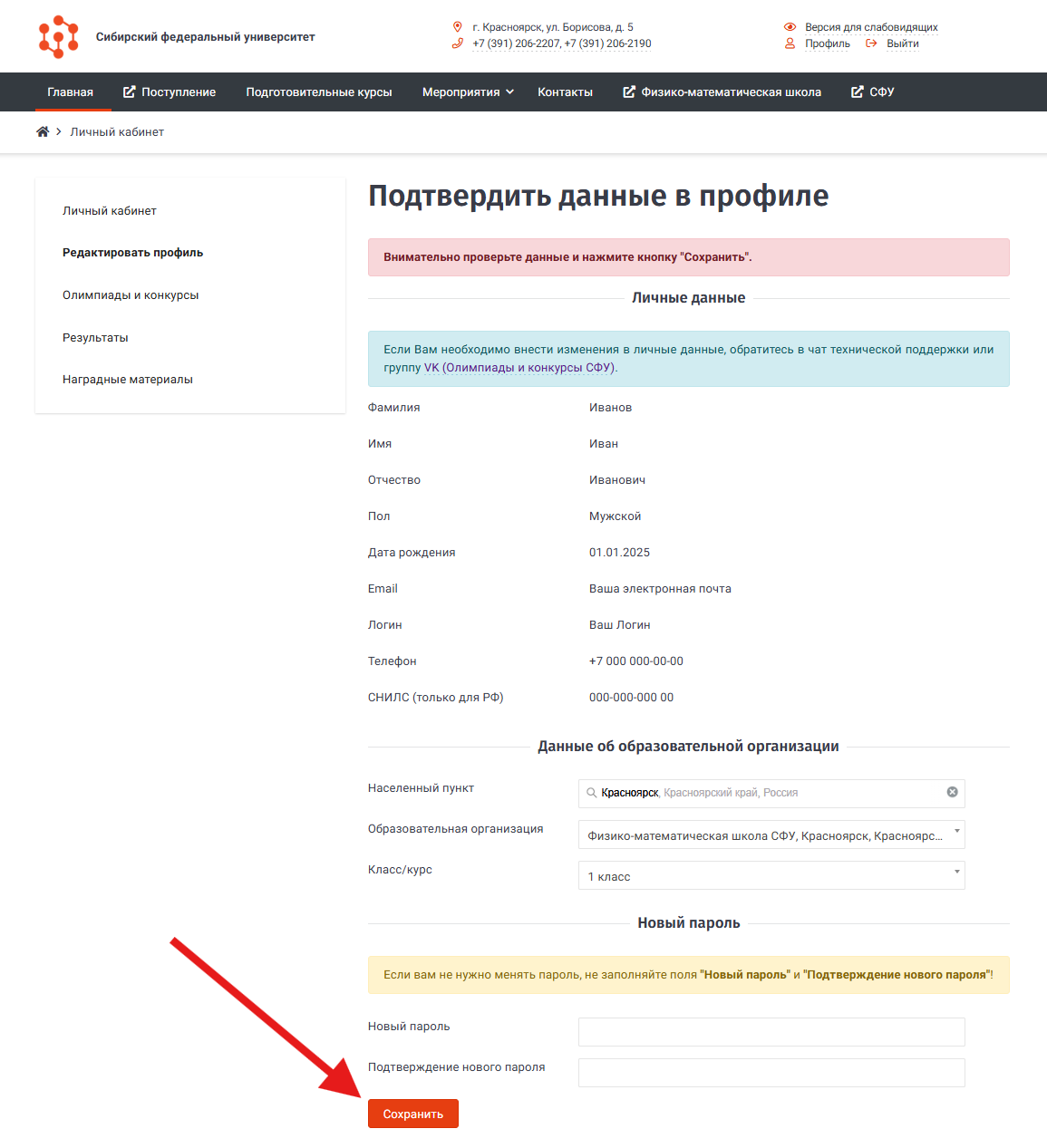С наступлением нового учебного года необходимо подтвердить данные в личном кабинете участника олимпиад и конкурсов Сибирского федерального университета.