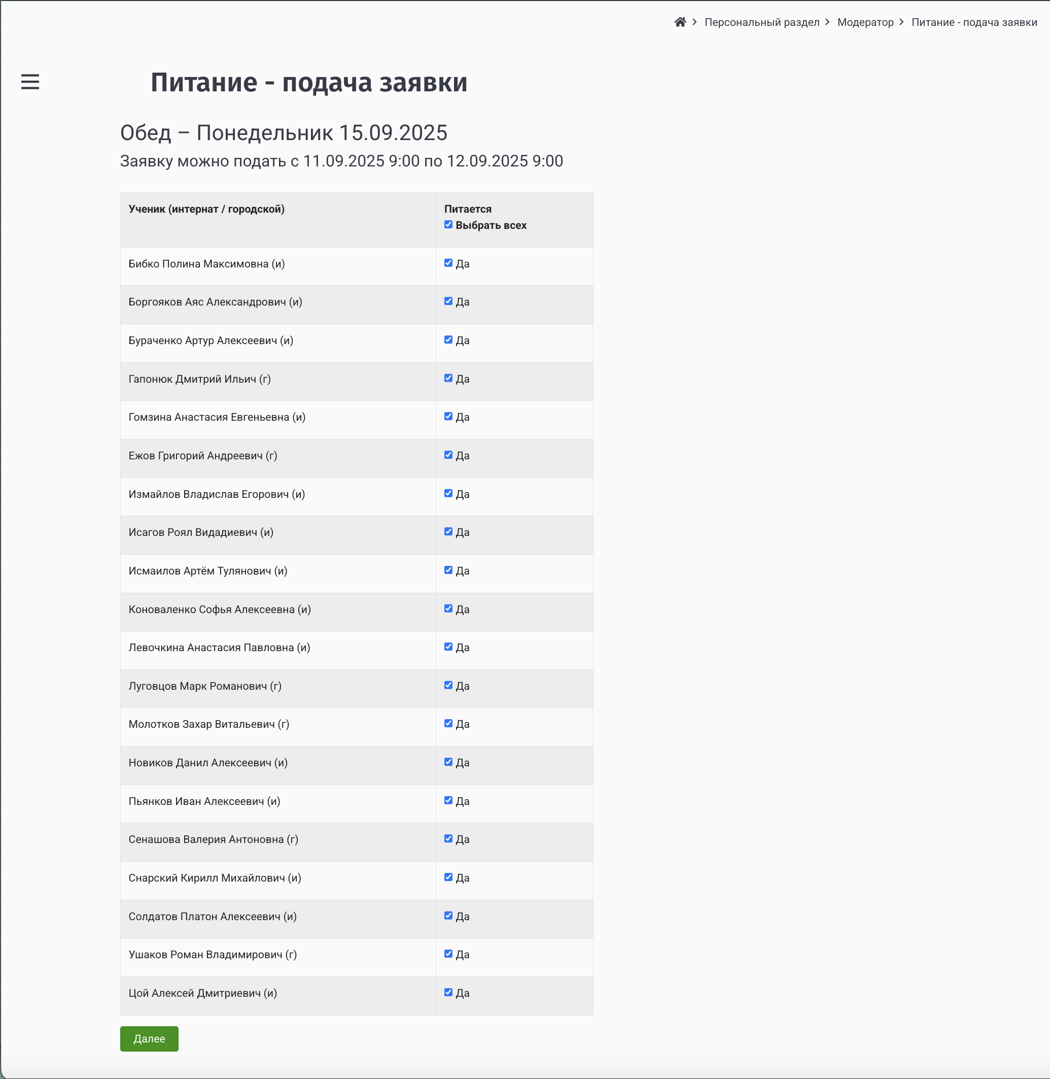 Таблица - показывает учащихся и столбец «Питается» (выбора школьников, которые питаюся). - «Выбрать всех» — кнопка массовой отметки учеников.